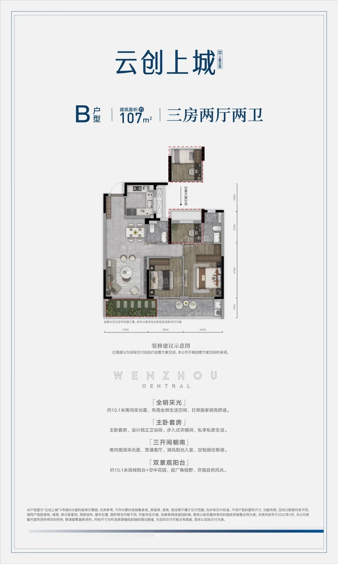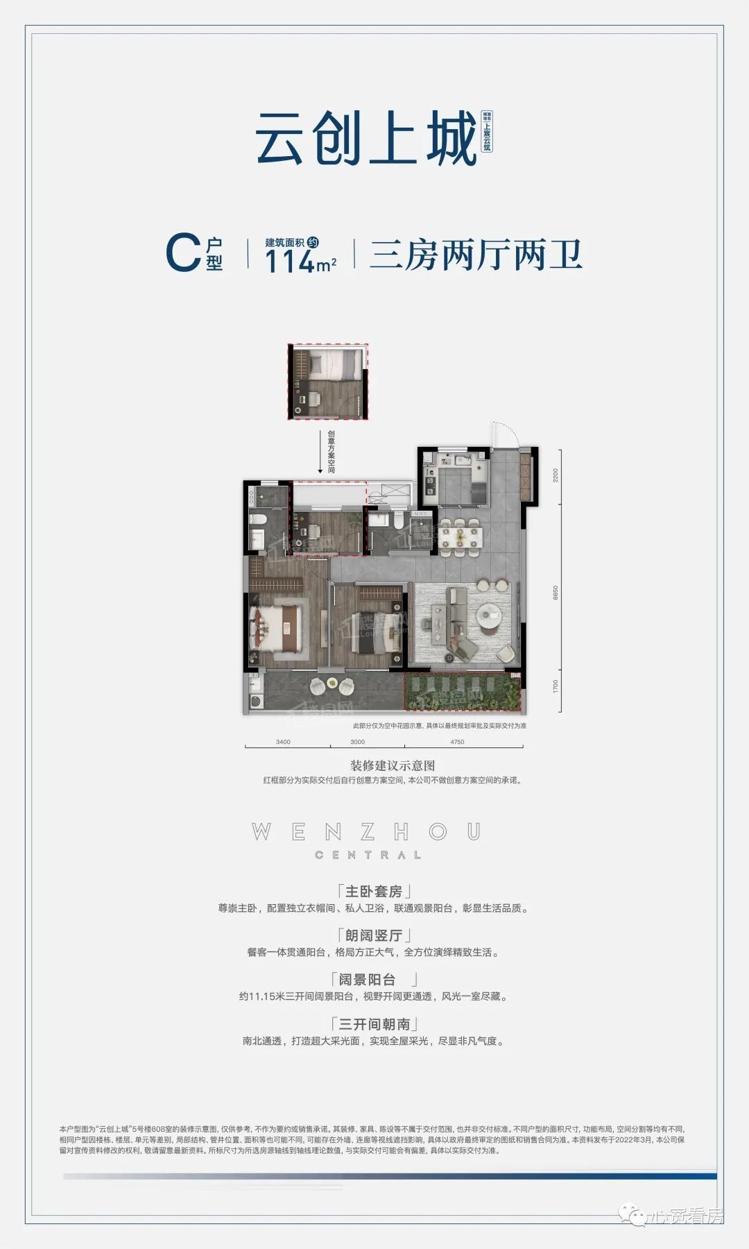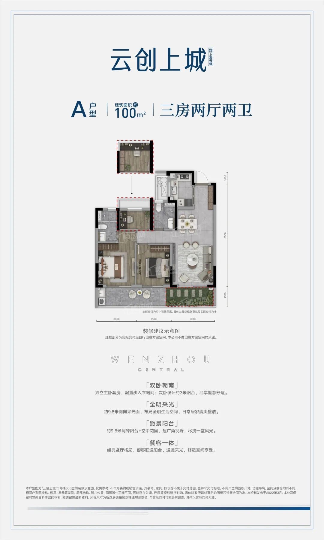 云创未来社区共有5个户型,当前有5个户型在售,100㎡的3室、107㎡的3室、114㎡的3室、128㎡的4室、143㎡的4室。其中100㎡的3室的A-100㎡三房两厅两卫户型特别受欢迎。该户型户型方正,南北通透,全明格局,动静分区,实用率高深受购房者的喜欢。具体户型情况如下