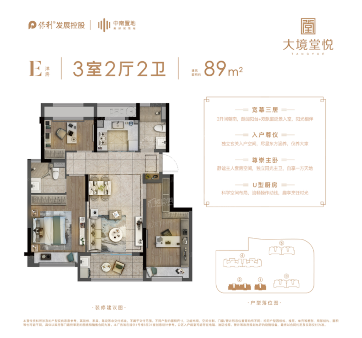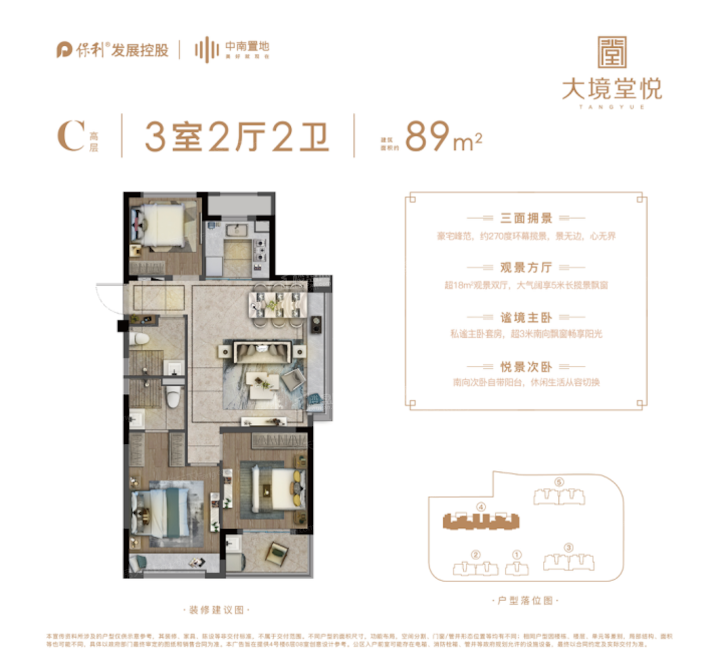 保利中南大境堂悦首座“堂悦”作品,告别了城芯老破小的人居印象,一举“境化”了城芯舒居体验。容积率仅约2.2的低密洋房住区,在一众高容积率的住宅中脱颖而出。 5幢8层洋房+11-18层小高层产品南低北高排布,景观覆盖率高达约69.9%,超1:1大栋距比(3#、5#),尊重舒居需求,将舒适度放大,试想从城芯繁华喧闹中归来,归家置身于舒适的花园洋房中,享氛围感十足的静谧日常,实现对品质生活的向往与追求。 示意图,实际交付以合同约定为准